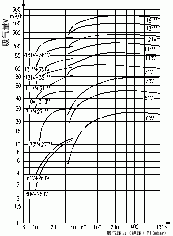 ③本例中為71V 注:該性能曲線是在吸入介質為20℃的飽和空氣,工作液溫度15℃,排氣壓力1013mba的狀態下得到的。性能允許差±10%,下圖為配用大氣噴射器的性能曲線。